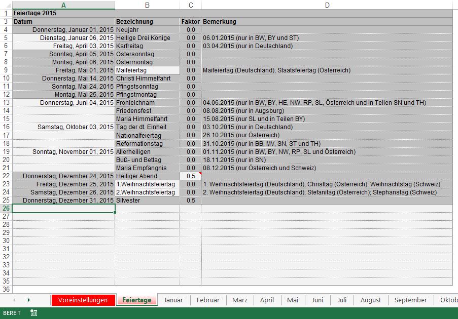 Auf der Registerkarte Feiertage werden alle Feiertage für Deutschland und Österreich automatisch berechnet und eingetragen.
