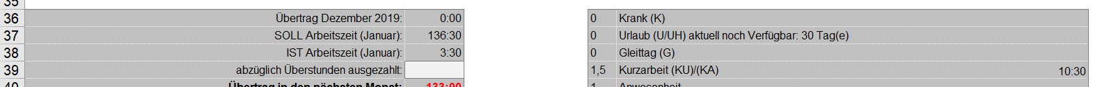 In der monatlichen Statistik (Monatstabellen Zeile 39) werden dann die Anzahl der Tage und die durch die Kurzarbeit entfallenen Stunden aufgelistet.