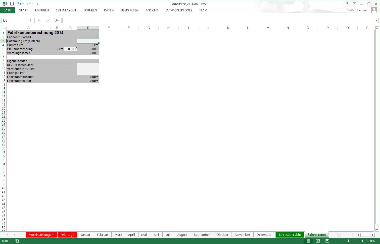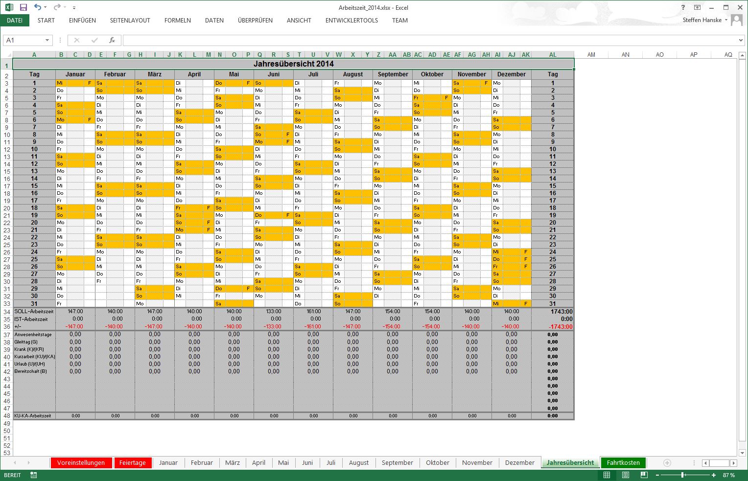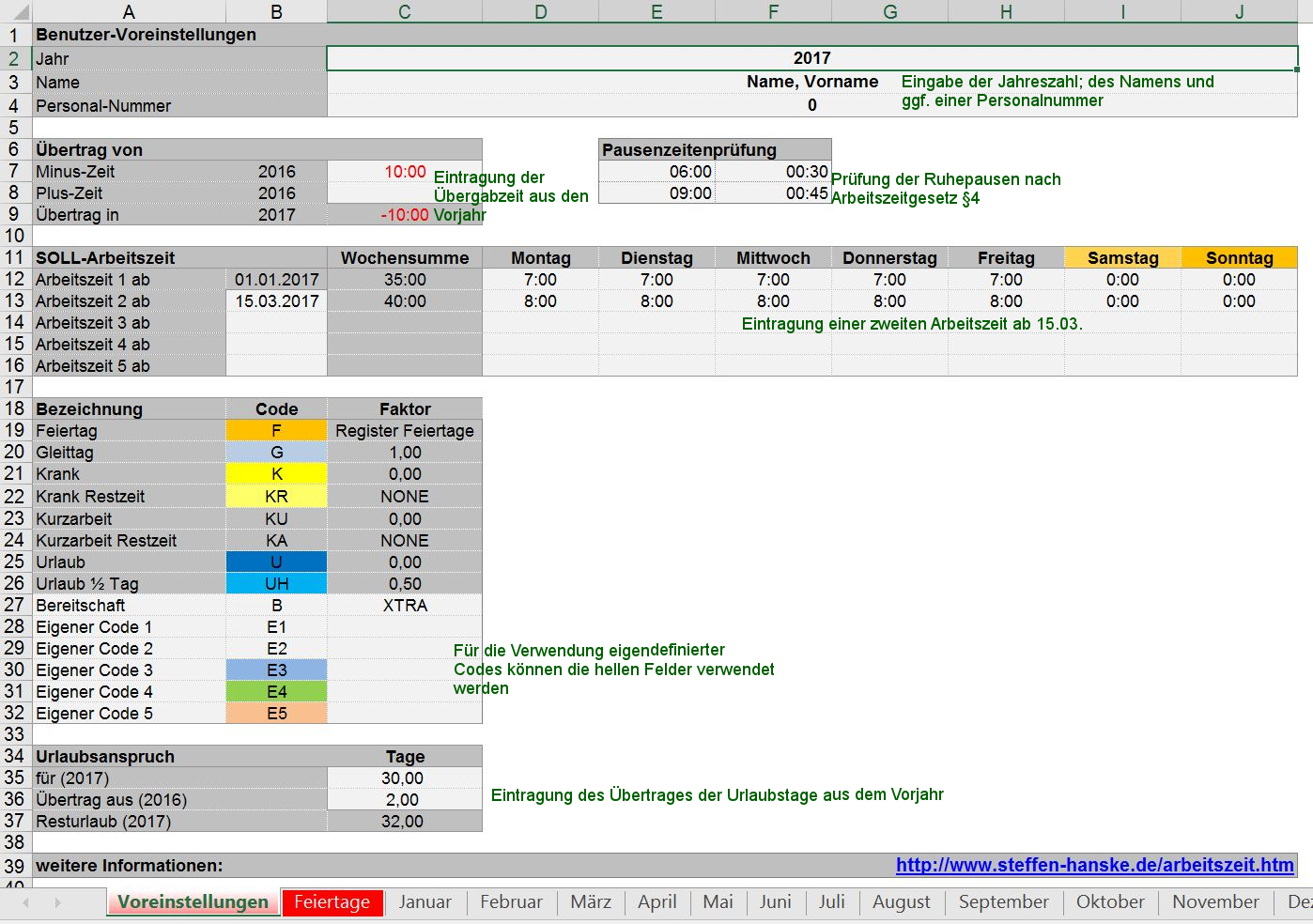 Im Arbeitsblatt Voreinstellungen die gewünschte Jahreszahl, Name, Arbeitszeiten, etc. eintragen danach noch auf dem