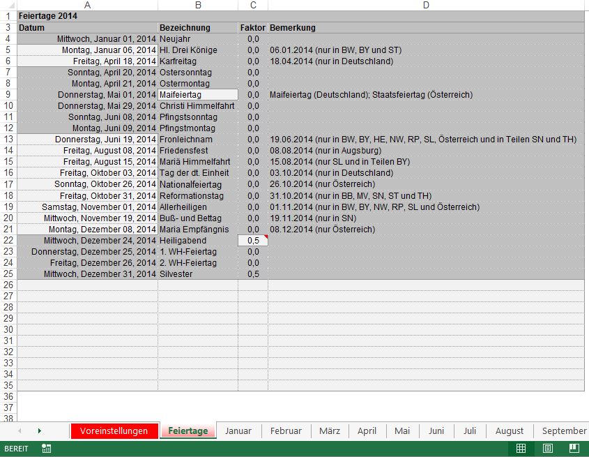November 2014: Berechnungsfehler bei individuellen Voreinstellungen mit Faktor 0,0 wurden bereinigt. Die Bezeichnungen der Feiertage für Österreich und die Schweiz wurden überarbeitet.