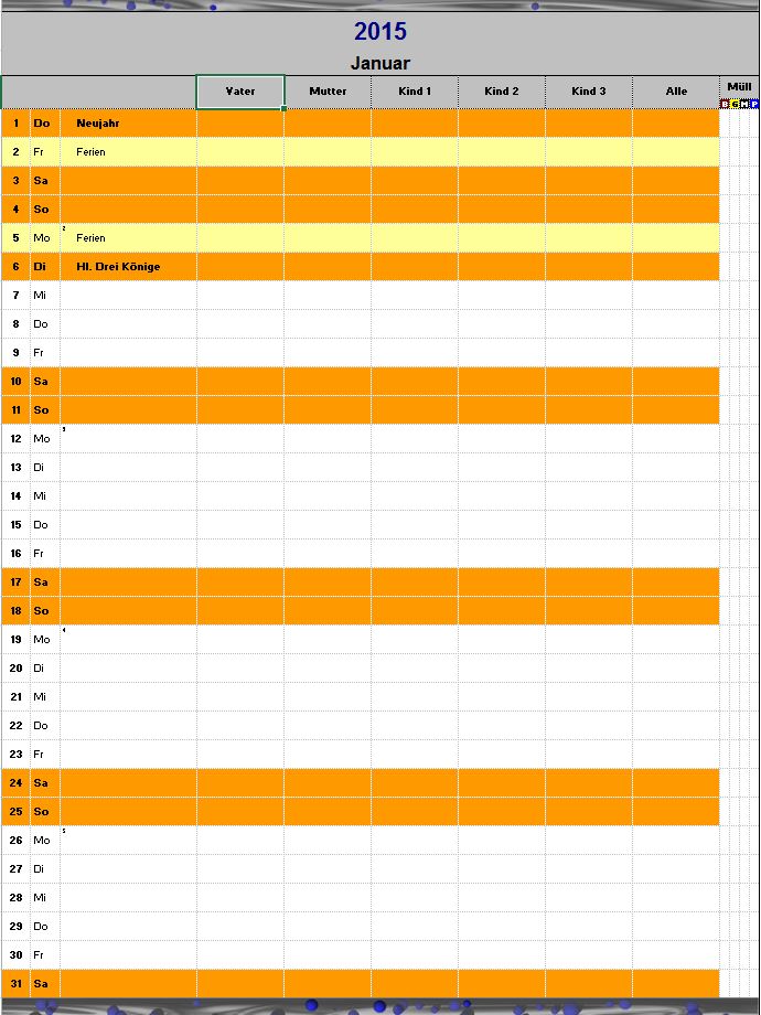 UPDATE November 2014: Vorausgefüllter Familienplaner für das Jahr 2015 bereitgestellt. Anpassung der Feiertage für Österreich und die Schweiz.